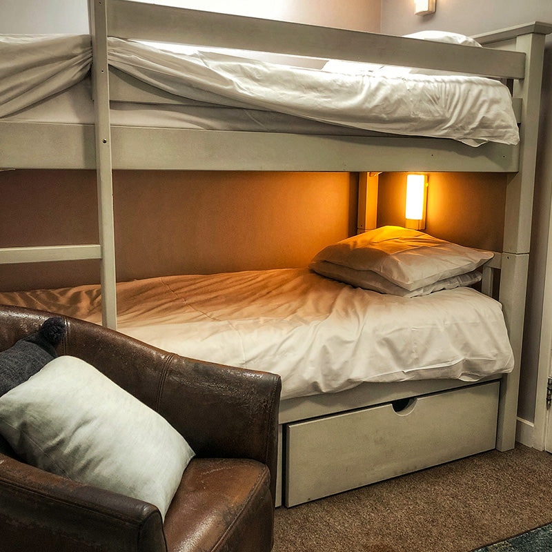 The Bunk Loft is on the first floor of a converted stone barn with secure bike storage below. It has three separate bunk rooms that sleep either two or four people with single occupancy available.